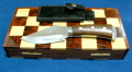 ”ツンビー”のグリップはチーク材です。チーク材は重硬で、かつては銃弾に当たっても裂けない弾力性から軍船の船材などにも使われてきました。また樹脂分が多いため耐水性抜群で腐りにくく年月を重ねるほどに風合い(いわゆるチーク色)が出ます。野球で使われるロージンパック(松ヤニが主成分)同様に、表面に僅かにしみ出る天然の樹脂成分のため手に吸い付くようにフィットし、手が濡れていても滑りにくく、握ったときのホールド感がとてもよい材です。包丁として使用する場合は手が濡れていることが多いのでチーク材が最適なのです。