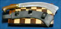 鞘については、ブレードの形が独特なため日本刀のように鞘から引く抜くことができません。そこで鞘は厚手の水牛の皮を縫製して3箇所でホック留めにしました。一応ベルトに通すこともできますが一動作で引き抜けないため基本的には腰につけて持ち歩くことは想定していません。